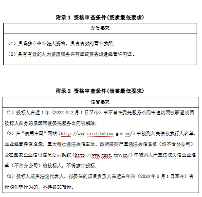 3.1.2信譽(yù)要求:(1)投標(biāo)人在近1年(2022年2月1日至今)中不曾在委托服務(wù)合同中違約而被驅(qū)逐或因投標(biāo)人自身的原因而使委托服務(wù)合同被解除;(2)在“信用中國”網(wǎng)站(http://www.creditchina.gov.cn/)中被列入失信被執(zhí)行人名單、企業(yè)經(jīng)營異常名錄、重大稅收違法失信主體、政府采購嚴(yán)重違法失信名單(均不含分公司)及在國家企業(yè)信用信息公示系統(tǒng)(http://www.gsxt.gov.cn/)中被列入嚴(yán)重違法失信企業(yè)名單(不含分公司)的投標(biāo)人,不得參加投標(biāo);(3)投標(biāo)人或其法定代表人、擬委任的項(xiàng)目負(fù)責(zé)人在近三年內(nèi)(2020年2月1日至今)有行賄犯罪行為的,不得參加投標(biāo);