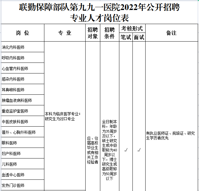 本次招聘的崗位,應聘人員應具備《聯(lián)勤保障部隊第九九一醫(yī)院2022年度公開招聘專業(yè)人才崗位表》中所報崗位的相關條件。