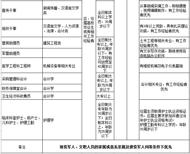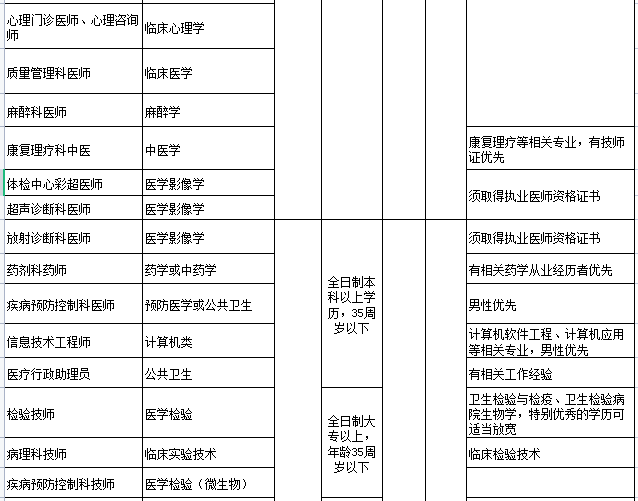 醫(yī)療崗位全日制本科,年齡為35周歲及以下,碩士研究生或中級職稱為40周歲以下,博士研究生或高級職稱為50周歲以下;護理崗位全日制大專以上學歷,年齡為30周歲以下,全日制本科年齡為35周歲以下;其它崗位年齡要求詳見崗位需求表,計算截止時間與公告發(fā)布時間一致。