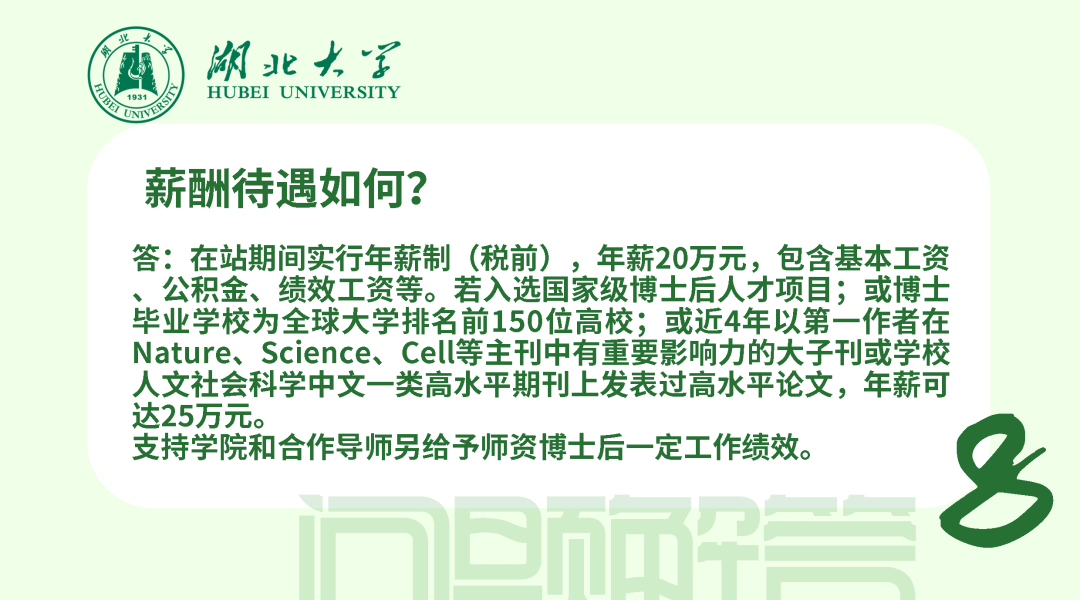 在站期間實(shí)行年薪制(稅前),年薪20萬元,包含基本工資、公積金、績效工資等。若入選國家級博士后人才項(xiàng)目;或博士畢業(yè)學(xué)校為全球大學(xué)排名前150位高校;或近4年以第一作者在nature、science、cell等主刊中有重要影響力的大子刊或?qū)W校人文社會科學(xué)中文一類高水平期刊上發(fā)表過高水平論文,年薪可達(dá)25萬元。